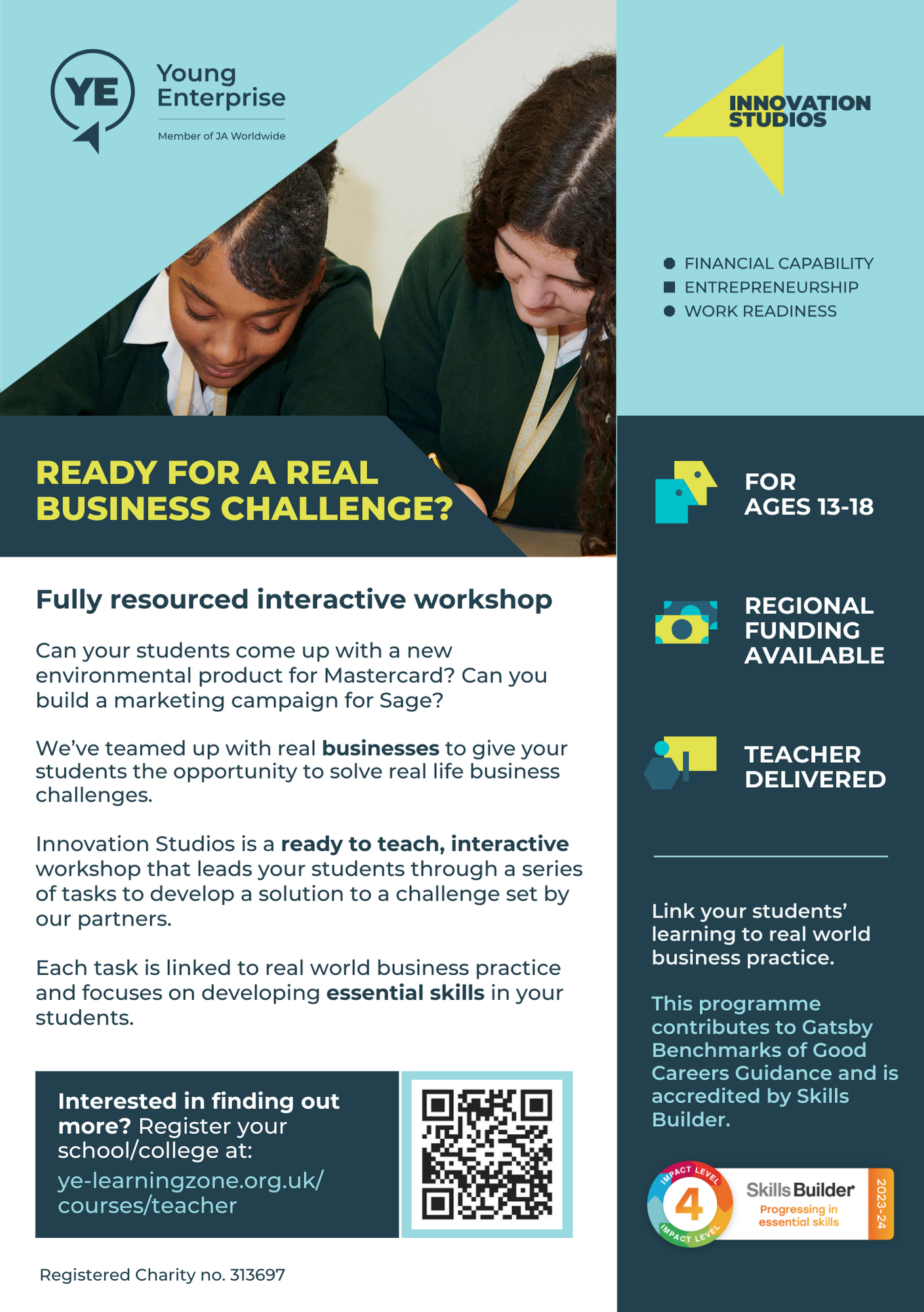 Innovation Studios is a ready to teach, interactive workshop that leads your students through a series of tasks to develop a solution to a challenge set by our partners.
